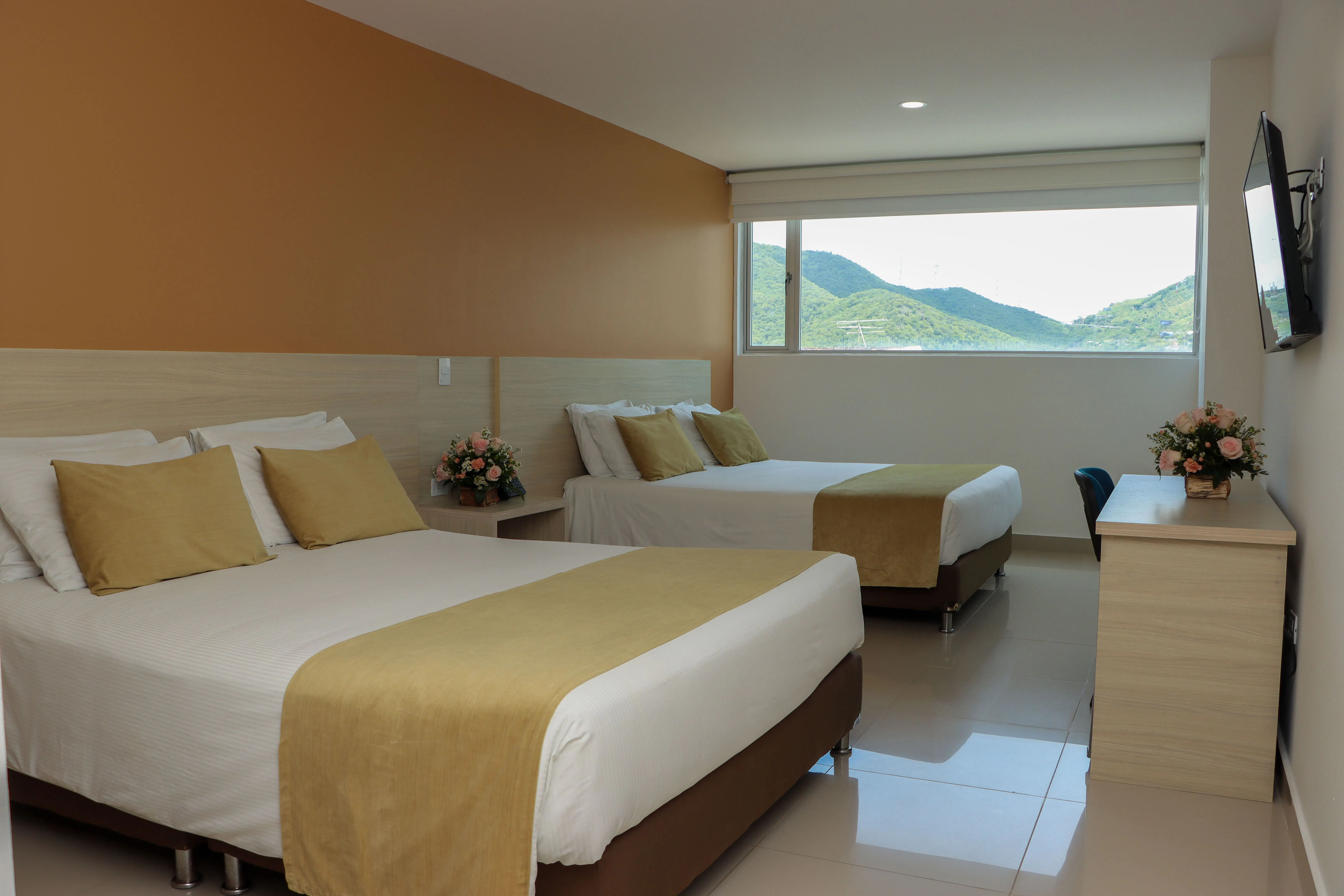 Triple room equipped with two double beds. It includes free Wi-Fi, room access card, private bathroom, hot water, hairdryer, air conditioning, safe, desk, mini fridge, and flat-screen TV. Ideal for enjoying a comfortable and pleasant stay.
